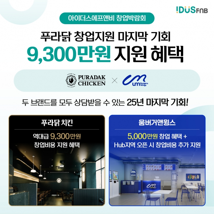 이번 행사는 2025년 푸라닭이 브랜드 10주년을 맞아 추진 중인 ‘푸라닭 2.0 프로젝트’의 핵심 모델인 ‘딥블랙’과, 빠른 성장세를 보이는 신규 브랜드 ‘움버거앤윙스’를 동시에 만나볼 수 있도록 기획됐다. 행사의 메인 테마인 ‘푸라닭 2.0 딥블랙’은 기존 배달 중심 모델을 넘어, 매장 방문 자체를 미식 경험으로 만드는 ‘치킨 다이닝 라운지’ 콘셉트의 홀 특화 매장이다. 기존 블랙&골드 아이덴티티를 고급화한 인테리어와 시그니처 플래터 등을 앞세워 배달과 홀 매출을 균형 있게 확보하는 수익 구조를 지향한다. ‘딥블랙’은 서울 발산역 직영점을 통해 운영 검증을 마쳤으며, 이번 박람회를 기점으로 전국 주요 상권 확장을 본격화할 예정이다. 함께 소개되는 ‘움버거앤윙스’는 압도적인 크기의 패티와 메가윙을 중심 경쟁력으로 내세운 브랜드다. 합리적인 가격대와 충분한 양을 제공해 고물가 시대의 소비자 수요를 반영했다. 이번 박람회에서는 운영 효율성과 실제 매장 경쟁력을 확인할 수 있는 프로그램도 마련된다. 아이더스에프앤비 관계자는 “이번 박람회는 확실한 검증을 거친 안정적 모델을 예비 창업자에게 투명하게 소개하는 자리”라며 “푸라닭 2.0 딥블랙 출범을 기념해 선착순 40호점에 최대 9300만원 상당의 창업 혜택을 제공하는 만큼 많은 관심을 바란다”고 말했다. 창업박람회 참가 신청은 ‘푸라닭 치킨’ 공식 홈페이지와 ‘움버거앤윙스’ 창업 홈페이지에서 가능하다. |