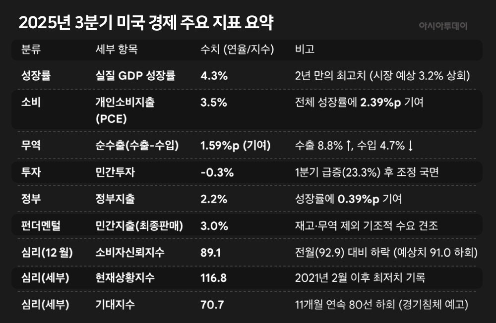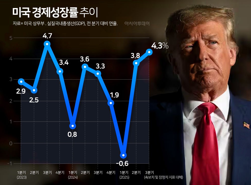 미국은 직전 분기 대비 성장률(계절조정)을 연율로 환산해 GDP를 발표한다. 미국 경제는 1분기 관세 부과를 앞둔 일시적 수입 급증 여파로 0.6% 역성장을 기록한 뒤, 2분기 3.8%로 반등했고, 3분기에는 그 흐름이 더욱 강화됐다.