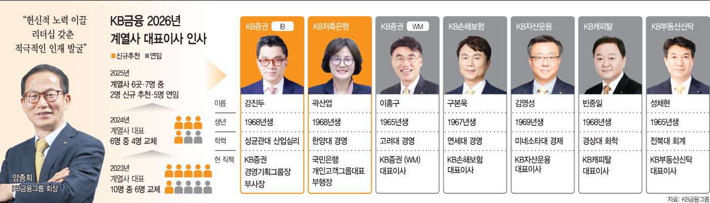16일 금융권에 따르면 KB금융은 이날 계열사대표이사후보추천위원회(대추위)를 열고 12월 임기가 만료되는 KB증권과 KB손해보험, KB자산운용, KB캐피탈, KB부동산신탁, KB저축은행 등 자회사 6곳의 대표이사를 추천했다.